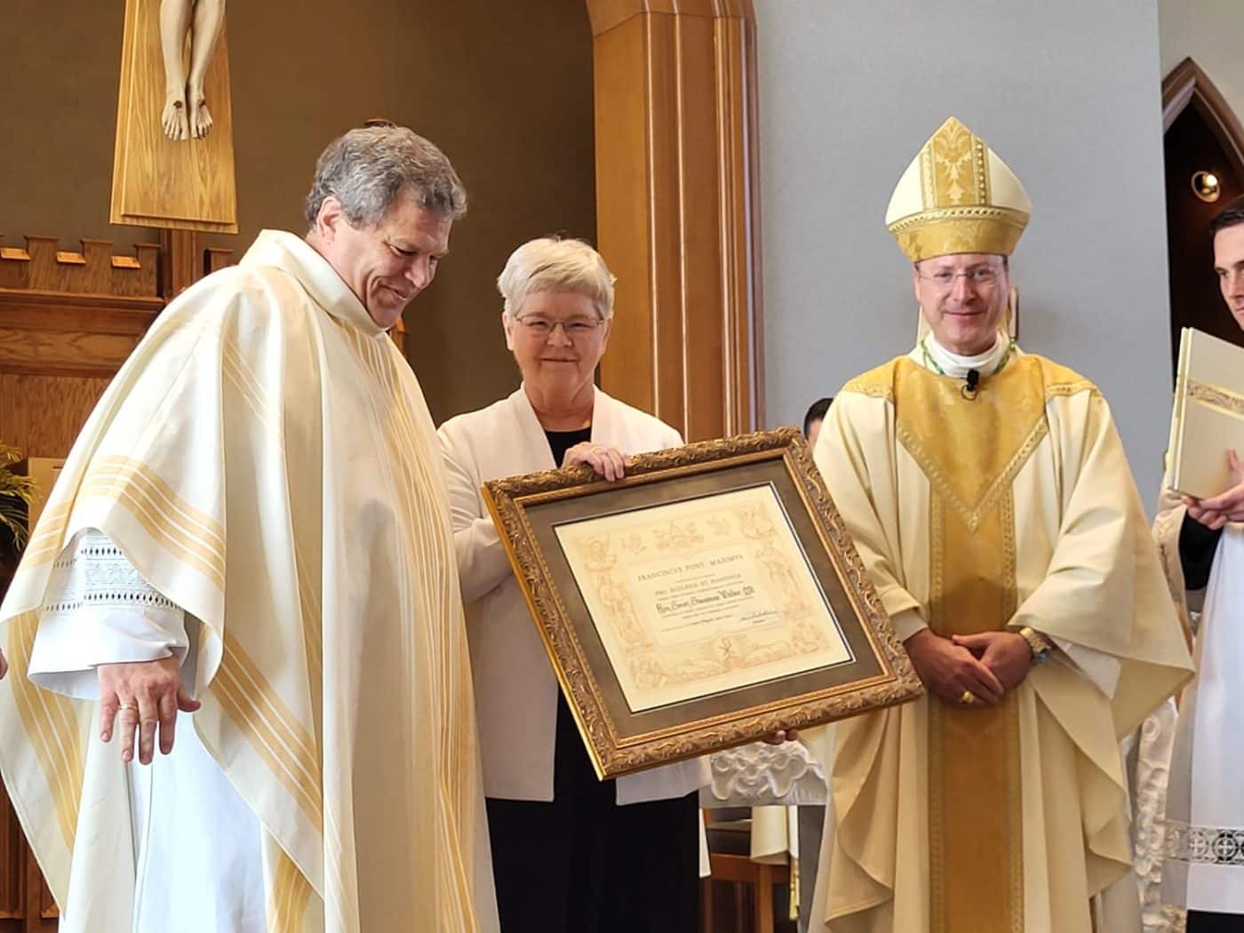 On the Pope’s behalf, Bishop W. Shawn McKnight presented Sister Suzanne Walker of the Dominican Sisters of Sparkill, N.Y., with the Cross Pro Ecclesia et Pontifice (“Cross for the Church and Pontiff”); and Connie Schepers and Deacon Ray Purvis, each with a Benemerenti Medal.