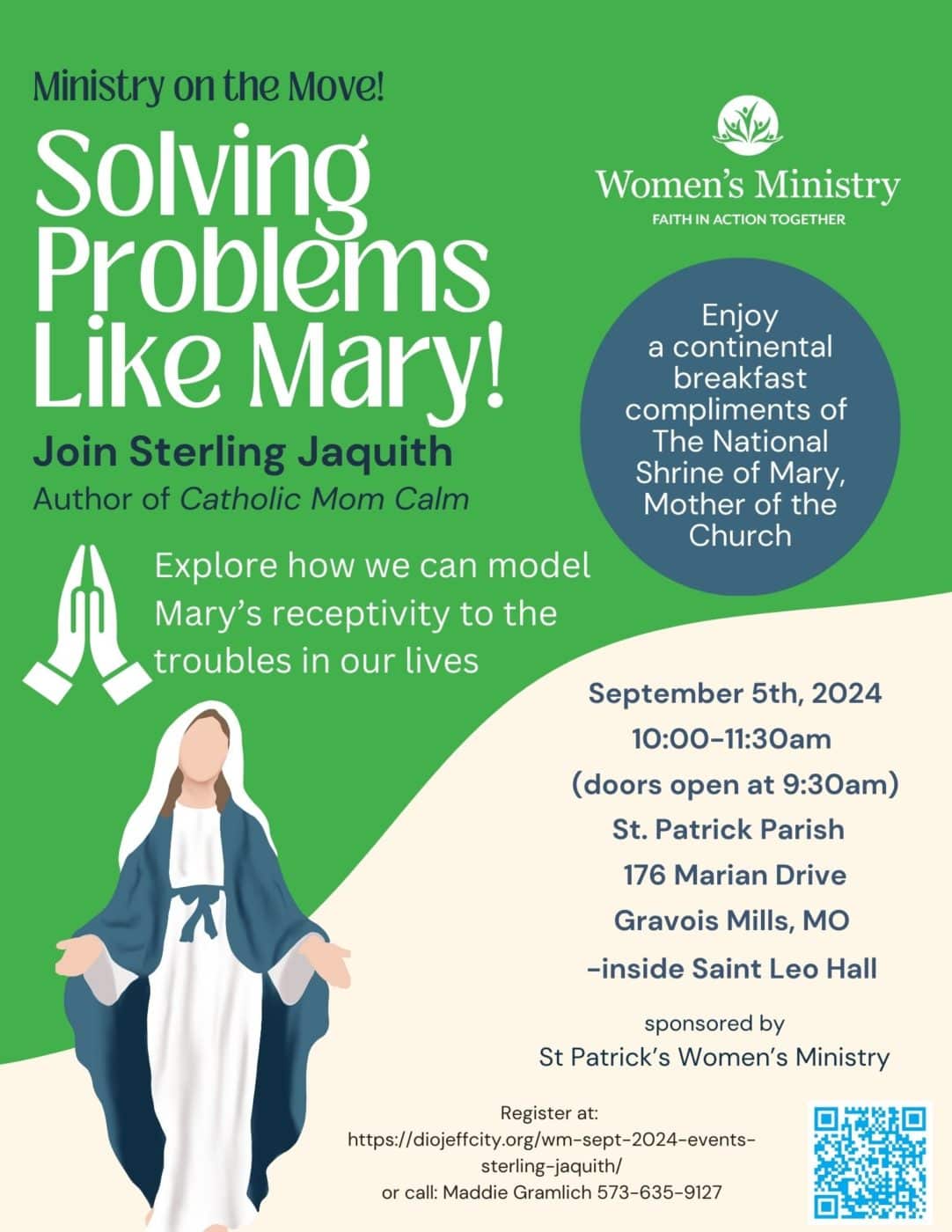 Join Sterling Jaquith, Author of Catholic Mom Calm and Barb Prasad for Ministry on the Move! Sterling will present on two topics: Solving Problems Like Mary, and Finding Peace in Any Storm. Food will be provided!