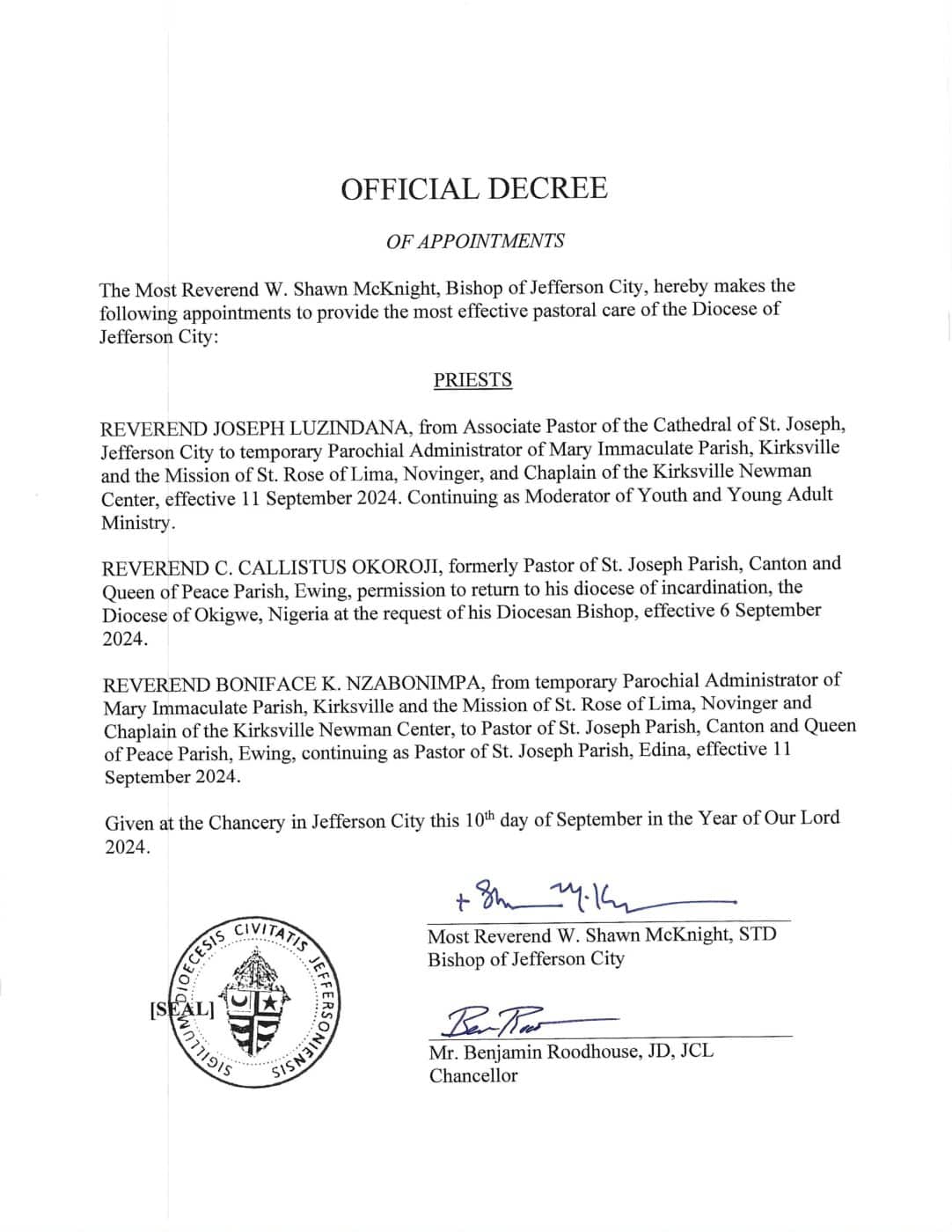 REVEREND JOSEPH LUZINDANA, from Associate Pastor of the Cathedral of St. Joseph, Jefferson City to temporary Parochial Administrator of Mary Immaculate Parish, Kirksville and the Mission of St. Rose of Lima, Novinger, and Chaplain of the Kirksville Newman Center, effective 11 September 2024. Continuing as Moderator of Youth and Young Adult Ministry.