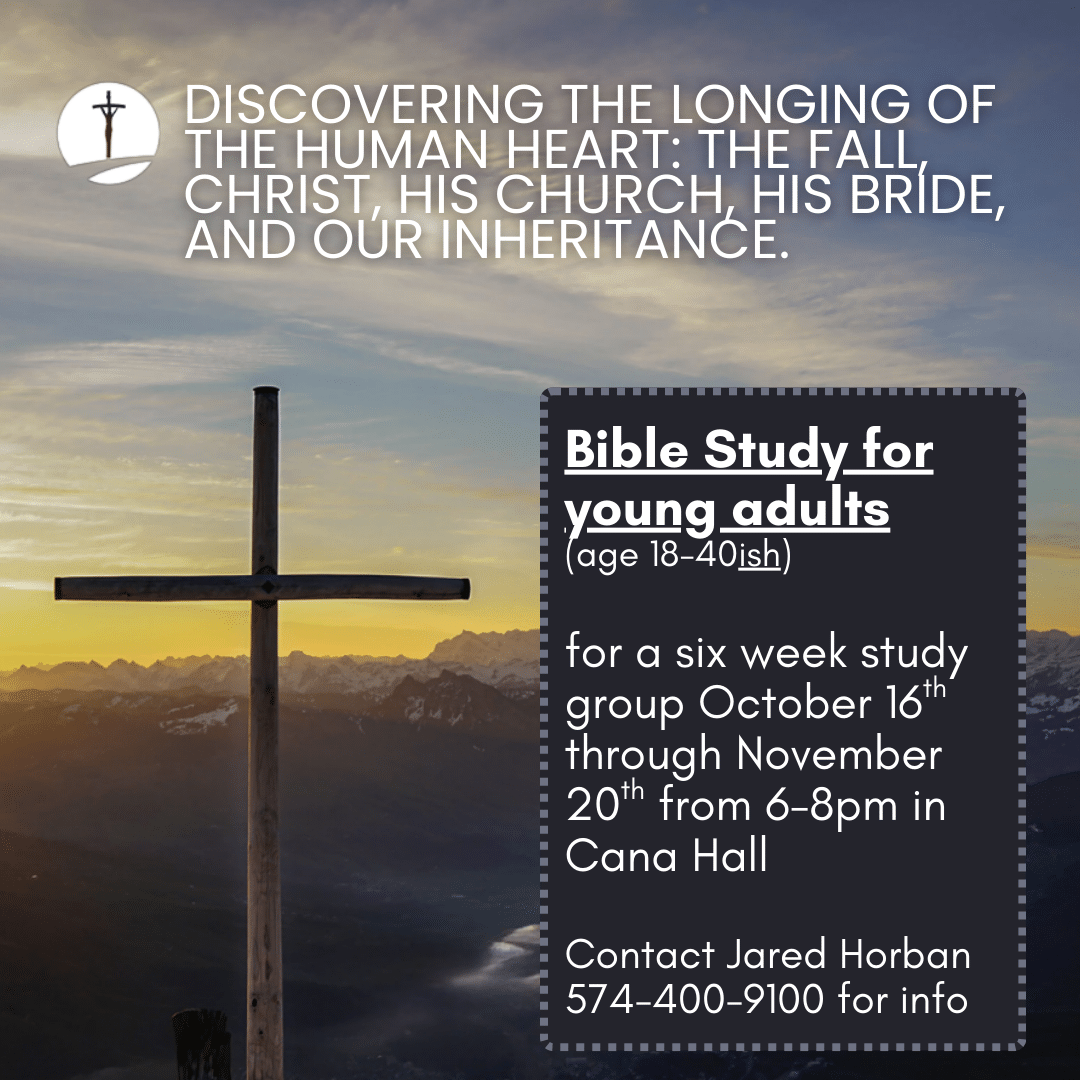 Our Young Adult Ministry is starting October 16th and I’m very excited to say that our young adults have been working towards building a vibrant young community here at the Cathedral. There will be a 6-week bible study which explores the longing of the human heart: the fall, Christ, His church, His bride, and our inheritance. Gatherings take place on Thursday nights from 6-8pm in Cana Hall, and this initial run goes from October 16 to November 20th . If you have a young adult or know any young adults, please encourage them to join this study. I ask all parishioners to pray for their efforts and that the Holy Spirit will bless them. If you’ve got questions, please contact Jared Horban 574-400-9100