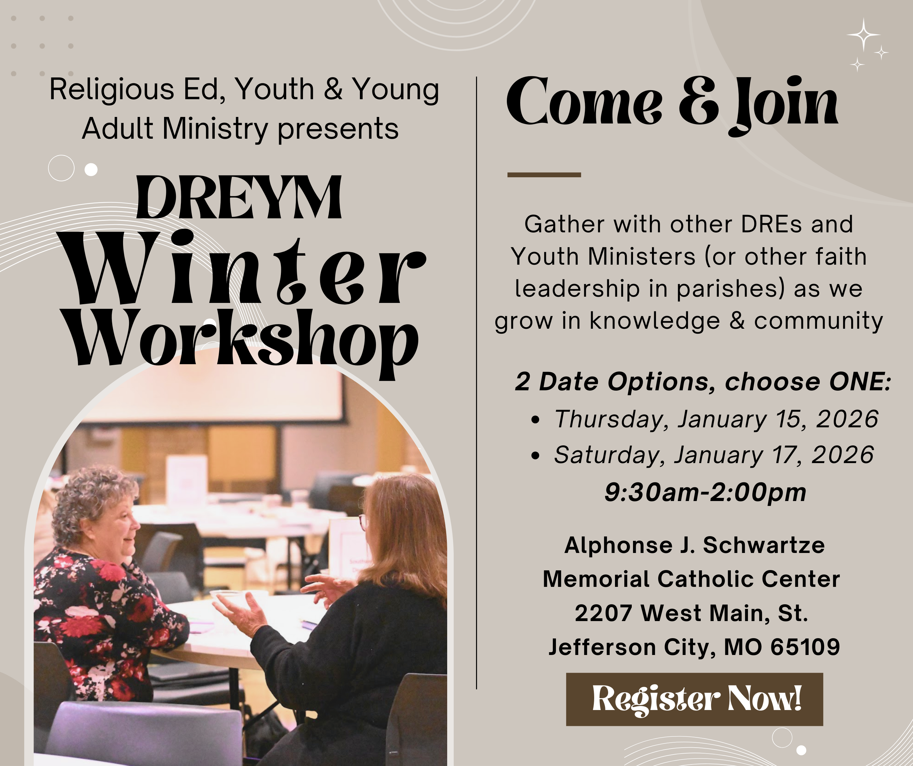 The Office of Religious Education, Youth, and Young Adult Ministry will host a Winter Workshop for DREs, Youth Ministers, and parish faith formation leaders on Thursday, January 15th, and Saturday, January 17th (the same workshop will be offered twice). Join us as we expand our knowledge, build community, and share resources to support parish ministry!