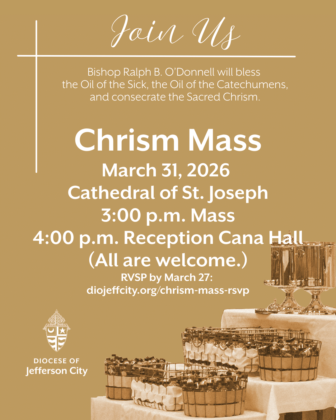 All are invited to the Diocesan Chrism Mass on March 31 at 3 p.m. at the Cathedral of St. Joseph. Please use the provided graphics to encourage the faithful in your parish to join us for this special annual liturgy. A light meal will be available in Cana Hall after the Chrism Mass and RSVPs are requested to provide an approximate count for the reception.