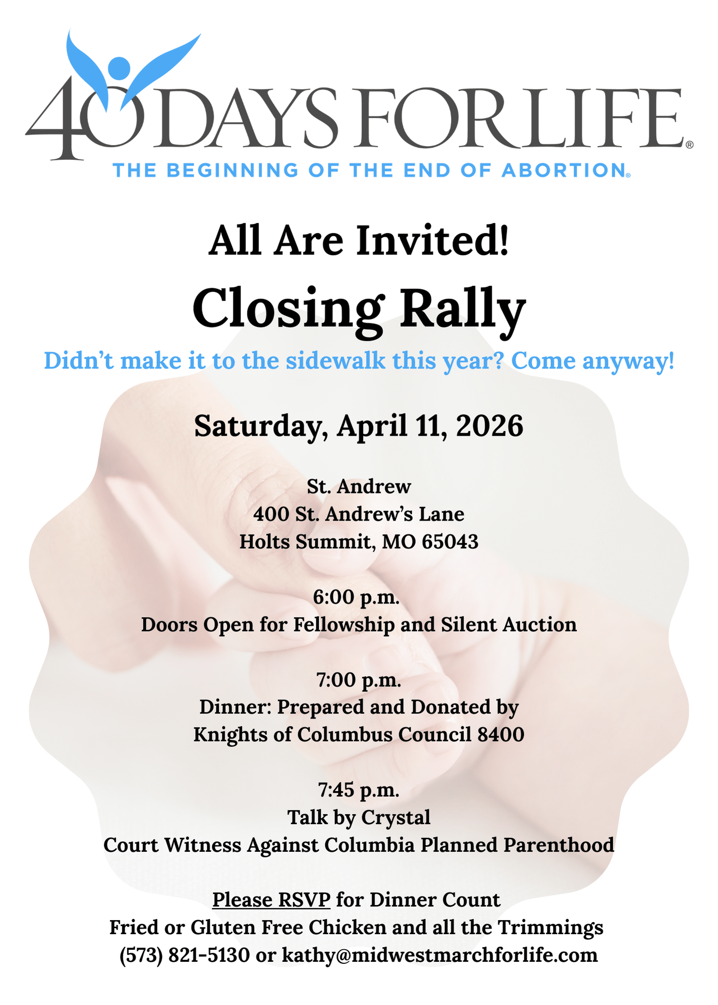 Join us on Saturday, April 11, 2026, at St. Andrew (400 St. Andrew’s Lane, Holts Summit, MO) as we come together to celebrate the conclusion of this year’s 40 Days for Life campaign. Even if you didn’t make it to the sidewalk this year, we would still love to have you there!