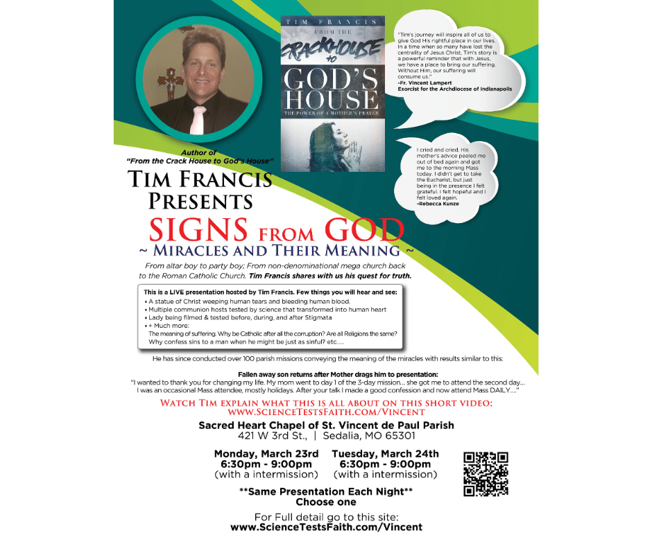 Signs from God, Miracles and Their Meanings. Come and learn the truths to be found in the Eucharist and strengthen your faith as we approach Holy Week. Join us at the Sacred Heart Chapel of St. Vincent de Paul Parish (421 W 3rd St, Sedalia, MO) from 6:30pm - 9:00pm on March 24 and 25. The presentation will be the same each night, choose which evening works best for you.