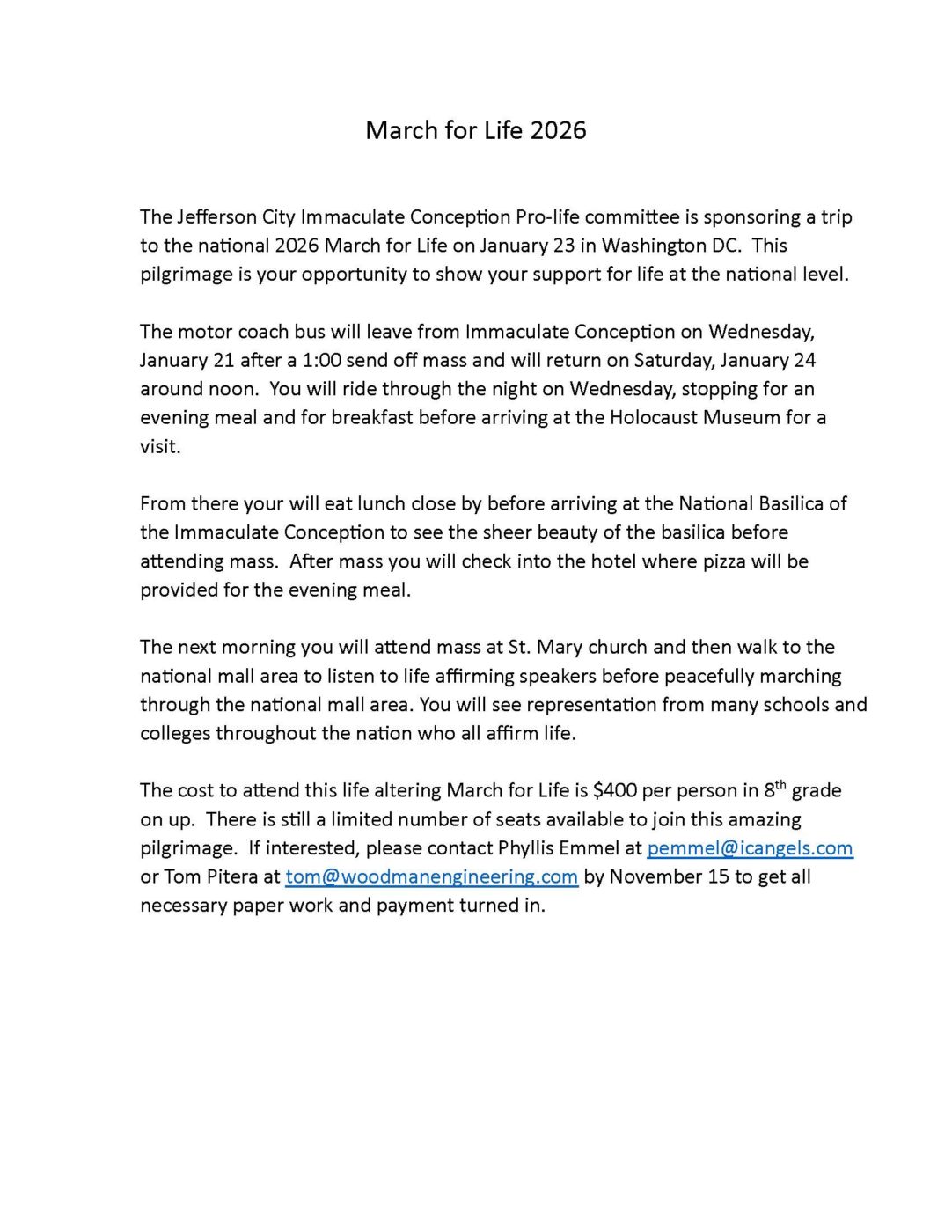 The Jefferson City Immaculate Conception Pro-life committee is sponsoring a trip to the national 2026 March for Life on January 23 in Washington DC. The cost to attend this life altering March for Life is $400 per person in 8th grade on up. There is still a limited number of seats available to join this amazing pilgrimage. If interested, please contact Phyllis Emmel at pemmel@icangels.com or Tom Pitera at tom@woodmanengineering.com by November 15 to get all necessary paperwork and payment submitted.