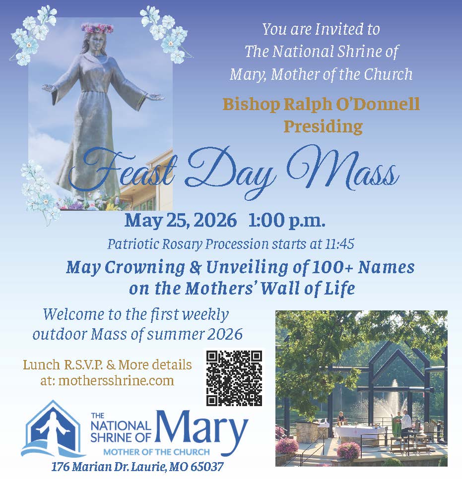 All are welcome to the Mothers’ Shrine on May 25th for the feast day celebration. Join Bishop Ralph O’Donnell, the Knights of Columbus, our expansive shrine community and many groups from our diocese in celebrating the Feast of Mary Mother of the Church. Celebration includes the Crowning of Mary, the first outdoor Mass this season, the Unveiling of the newest mothers’ names on the Mothers’ Wall of Life and a KofC fundraiser lunch. Lunch R.S.V.P. and more information at: mothersshrine.com