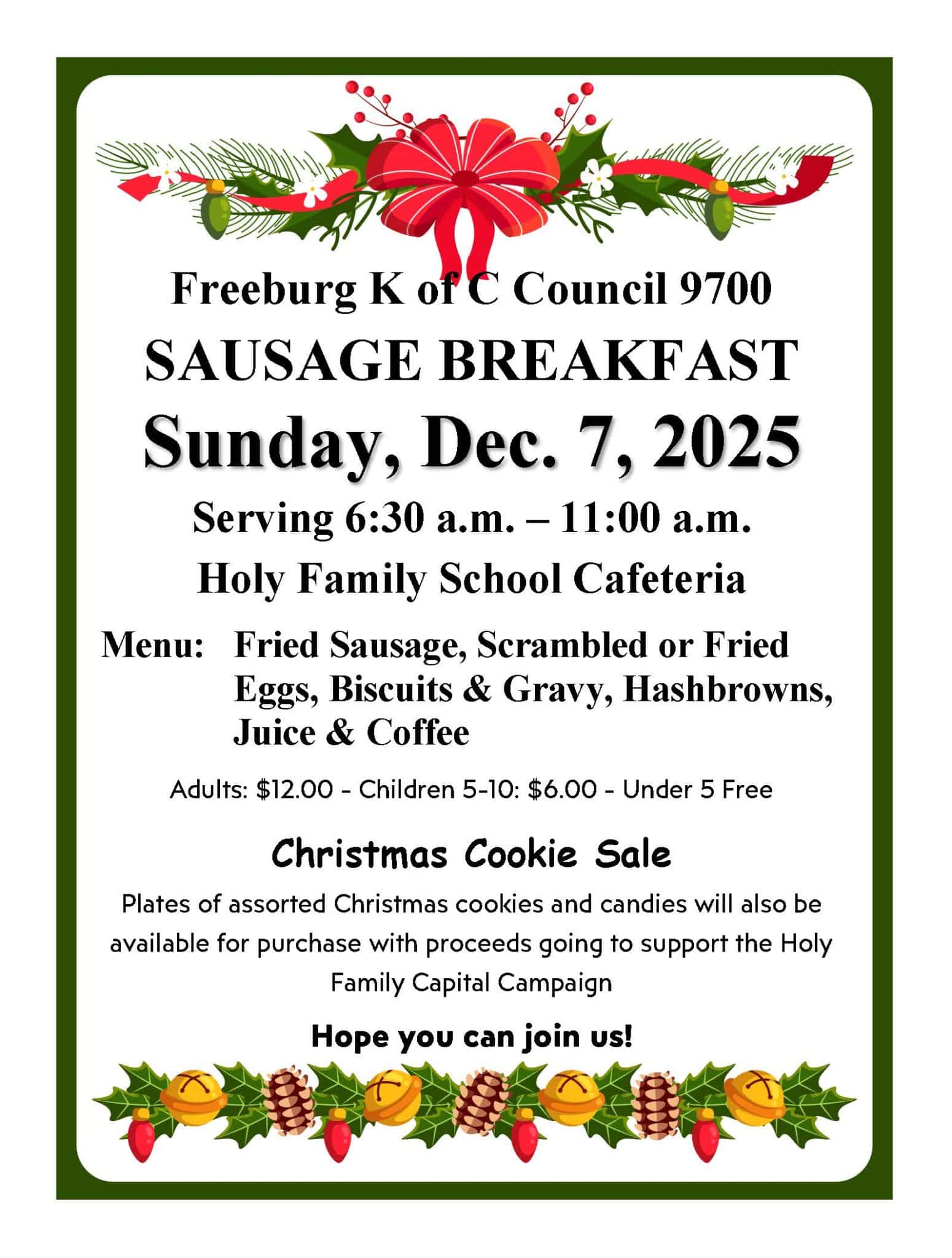 The Freeburg K of C Council 9700 will host a Sausage Breakfast on Sunday, December 7, 2025. They will be serving from 6:30 a.m. – 11:00 a.m. in the Holy Family School Cafeteria. Menu includes fried sausage, fried or scrambled eggs, biscuits and gravy, hashbrowns, juice and coffee. Adults $12; Children 5-10 $6 and under 5 free. There will also be plates of assorted Christmas Cookies and Candies for purchase.