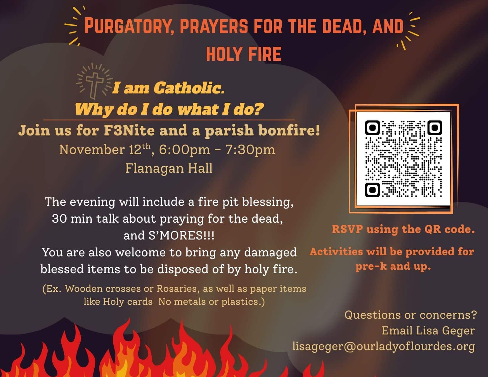 Fr. Gregory Clever will be hosting this event to discuss: Purgatory, Prayers for the Dead and Holy Fire. Please bring any blessed items that can be consumed by holy fire to be properly disposed of. Ex. wooden crosses and Rosaries, prayer cards etc. No plastics or metal. Please bring some S’more fixings to share with the group to prepare by normal fire. Childcare is available, please RSVP! You can also bring your own fire pit for a special blessing as well!