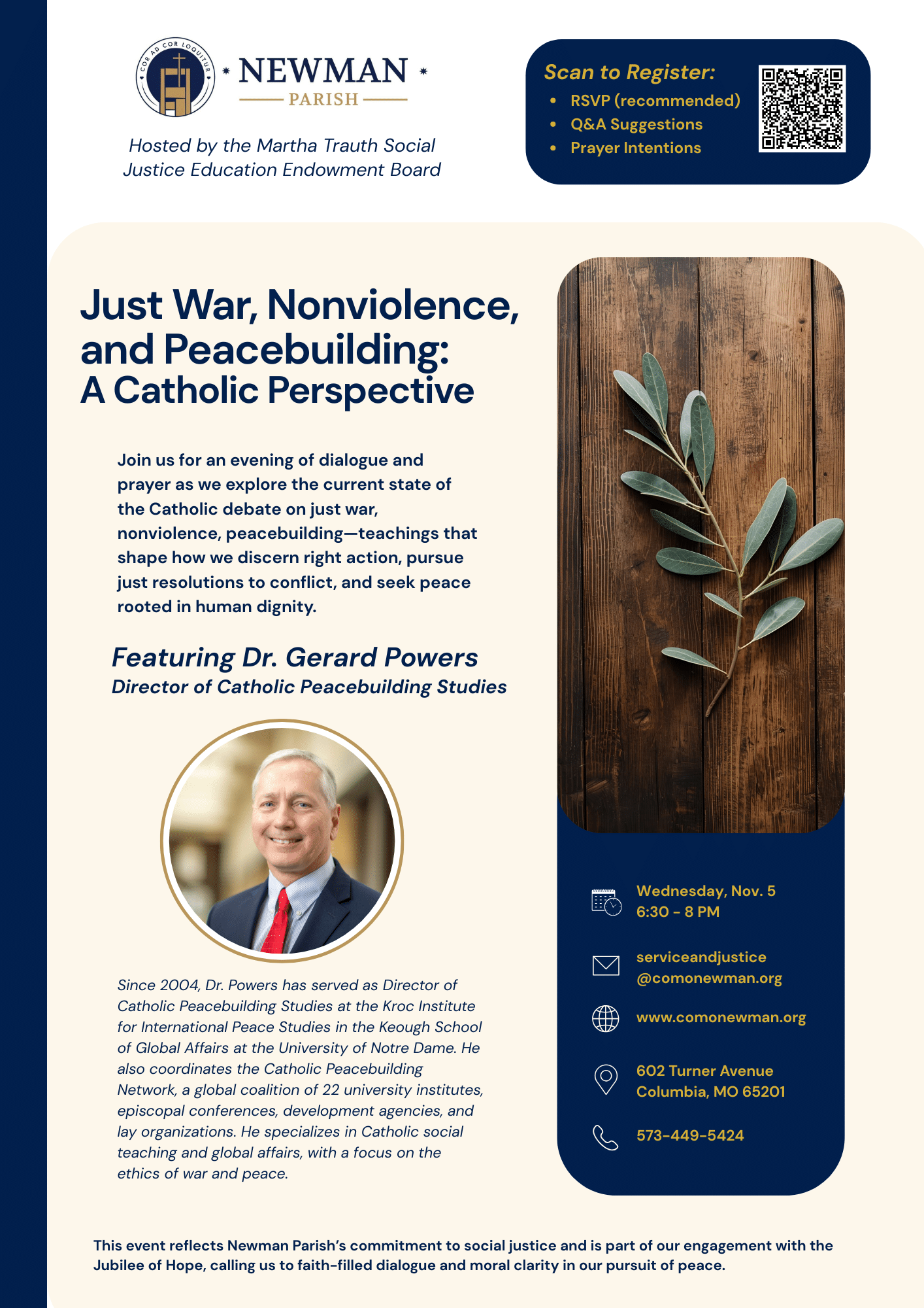Join us on Wednesday, Nov. 5, from 6:30–8:00 PM at Newman Church (602 Turner Ave) for a presentation by Dr. Gerard Powers of the University of Notre Dame’s Kroc Institute for International Peace Studies. Dr. Powers will discuss Just War Theory and Catholic peacebuilding—timely topics amid today’s global conflicts and moral questions about violence, justice, and peace. The evening will include prayer, presentation, discussion, and light refreshments. This event is open to the public and hosted as part of Newman’s ongoing commitment to social justice.