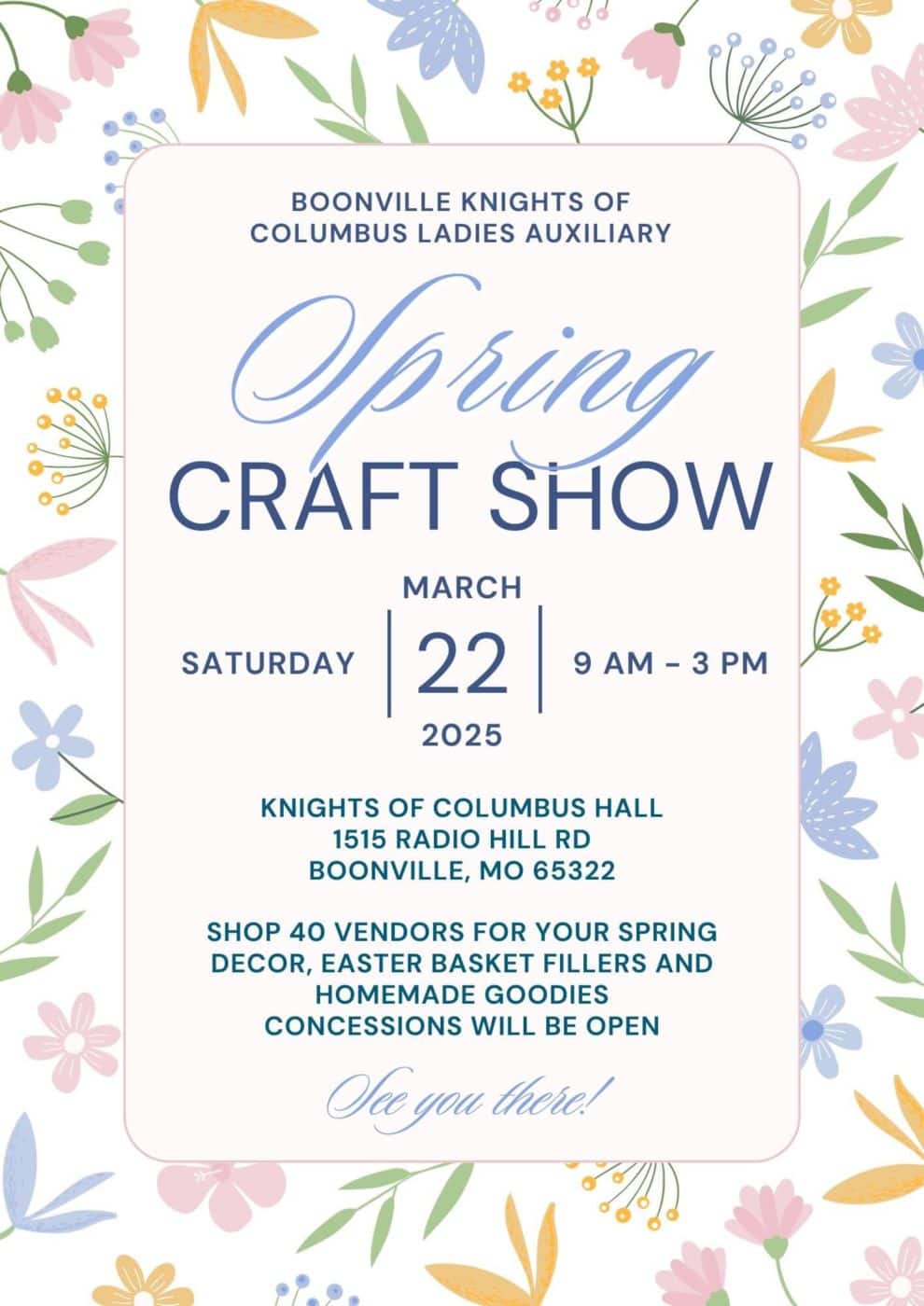 The Boonville KC Ladies Auxiliary is hosting a Spring Craft Show. Shop 40 vendors for your spring décor, Easter basket fillers, and homemade goodies! The concession stand will be open!