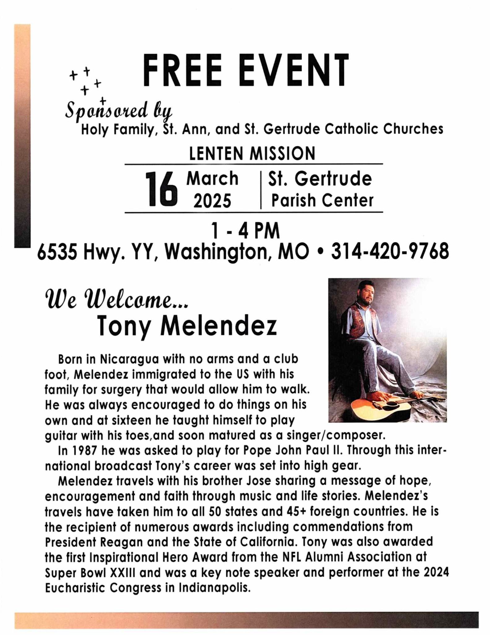 Join us for a free Lenten Mission with Tony Melendez! Born in Nicaragua with no arms and a club foot, Tony taught himself to play guitar with this toes and is now a highly recognized singer/composer. He travels with his brother Jose sharing a message of hope, encouragement and faith through music and life stories. Among his numerous accolades, he was a keynote speaker and performer at the 2024 Eucharistic Congress in Indianapolis.