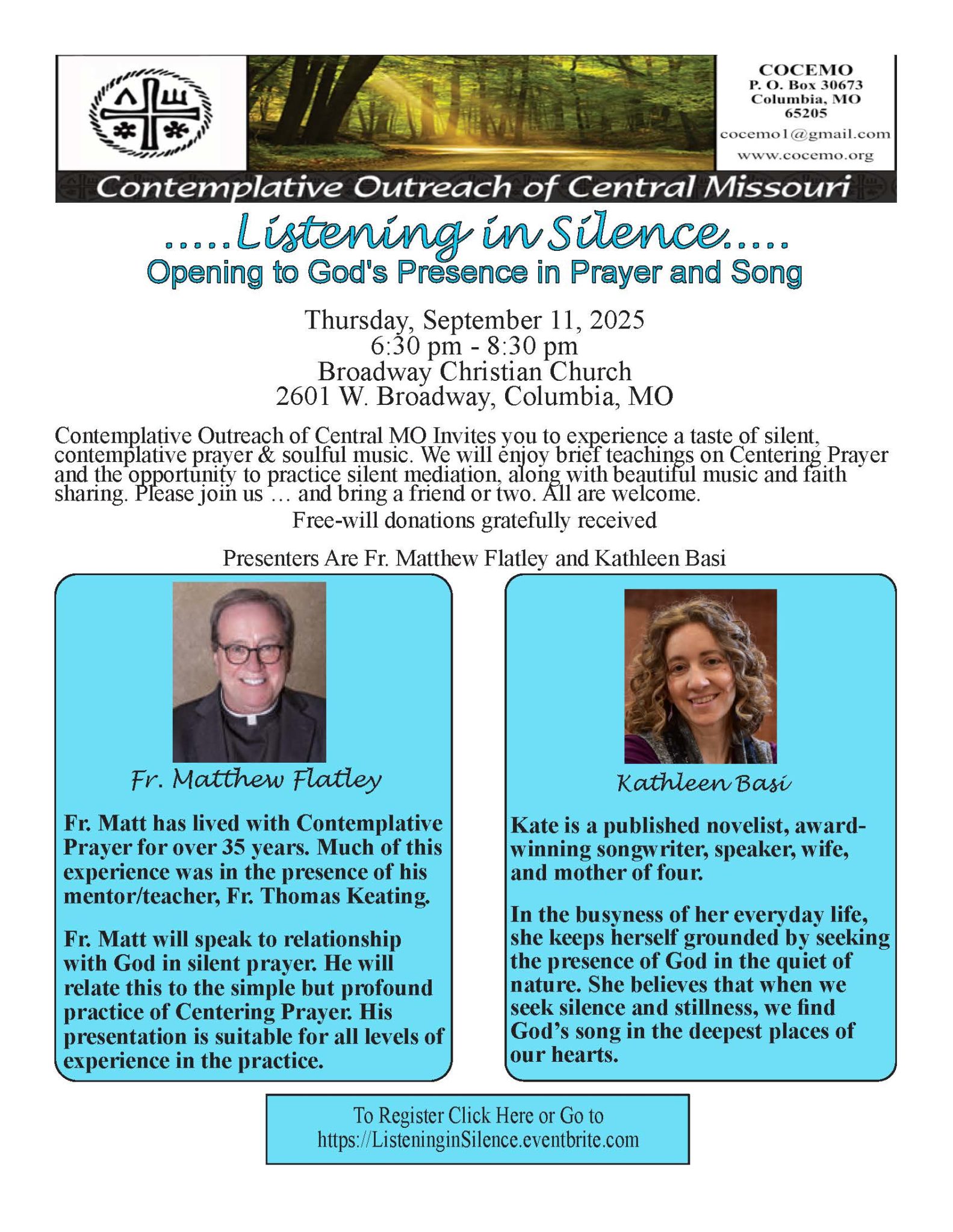 Contemplative Outreach of Central Missouri invites you to experience a taste of silent, contemplative prayer and soulful music. Fr. Matthew Flatley, pastor of Immaculate Conception parish, will give an overview teaching on Centering Prayer and the opportunity to practice silent meditation. Kathleen (Kate) Basi, award winning composer & member of Our Lady of Lourdes parish will provide beautiful music and sharing of how she finds stillness in her busy life. For details go to www.cocemo.org.