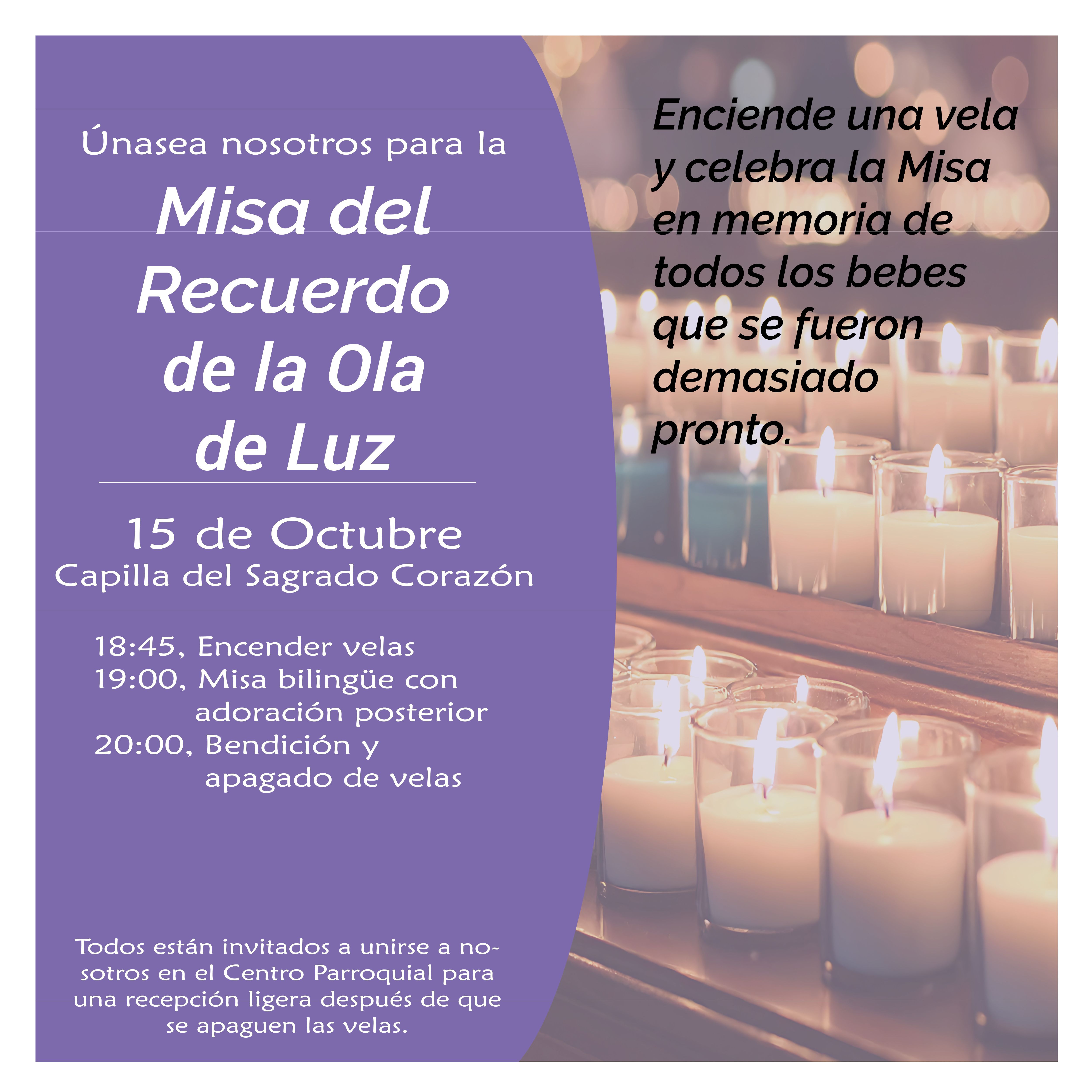 Muchos en nuestra comunidad se han sentido conmovidos por la desgarradora pérdida de un bebé que falleció prematuramente. Si usted o alguien que conoce ha experimentado este dolor, lo invitamos a una Misa especial de la Ola de Luz de Memoria el miércoles, 15 de octubre en la Capilla del Sagrado Corazón. Se encenderán las velas a las 6:45 pm, en seguida con la Santa Misa a las 7:00 pm. Después de la Misa, continuaremos con la Adoración Eucarística hasta las 8:00 pm, concluyendo con la Bendición y apagando las velas.