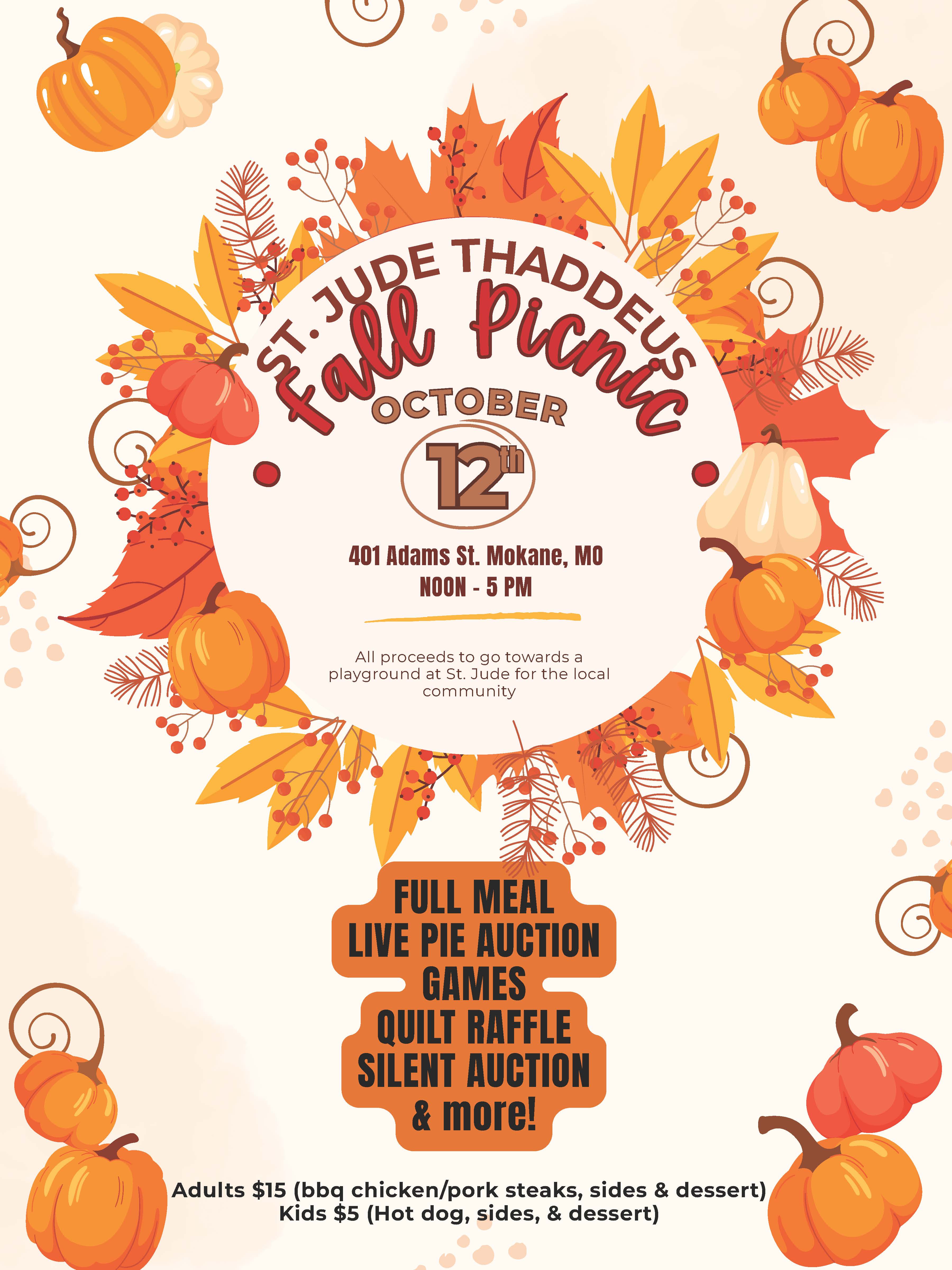 Join us for our annual Parish Picnic on Sunday, October 12, 2025, at St. Jude in Mokane, MO! Enjoy food, fellowship, and fun with our parish community. We look forward to seeing you there!