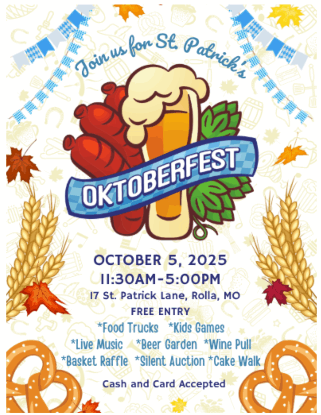 All are welcome to attend St. Patrick’s Oktoberfest on Sunday, October 5, 2025 in Rolla, MO from 11:30am-5:00pm. There will be food trucks, live music and entertainment, kids games, a beer garden and wine pull, basket raffle, silent auction. Cash and card will be accepted. Free entry to the event.