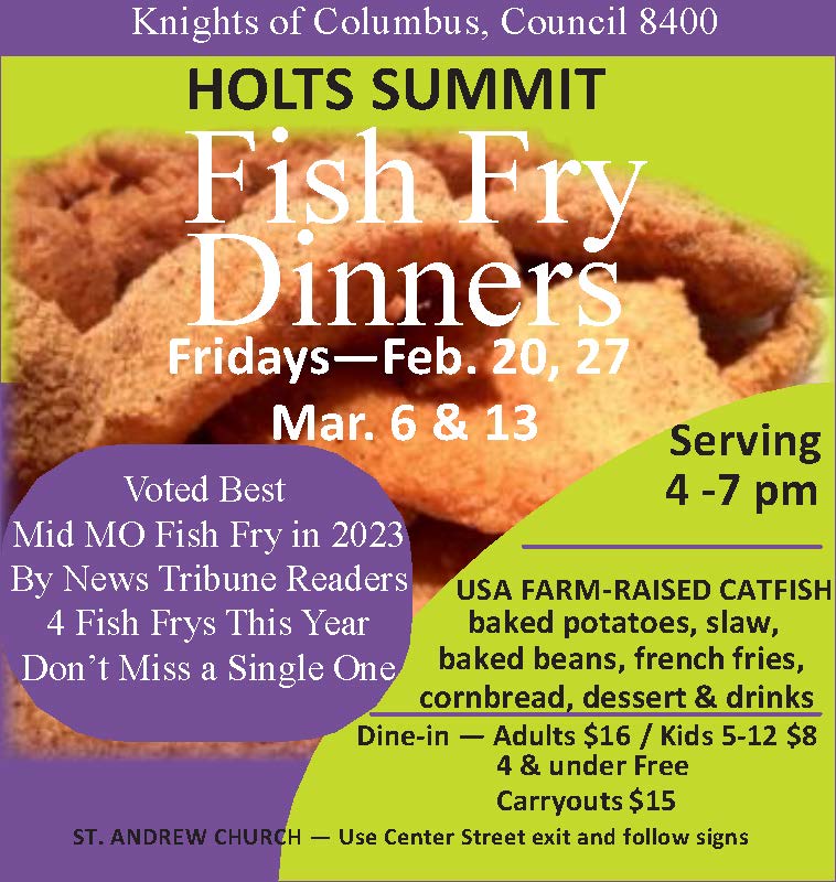 Knights of Columbus, Council 8400 2026 Lenten Fish Frys February 20, 27, March 6 & 13 Serving from 4:00 until 7:00 Serving from Veit Hall, St. Andrew Catholic Church 400 St. Andrew Drive, Holts Summit, MO All Events are Dine-In and Carry Out Take the Center Street Exit and Follow the Signs Dine In: $16… |