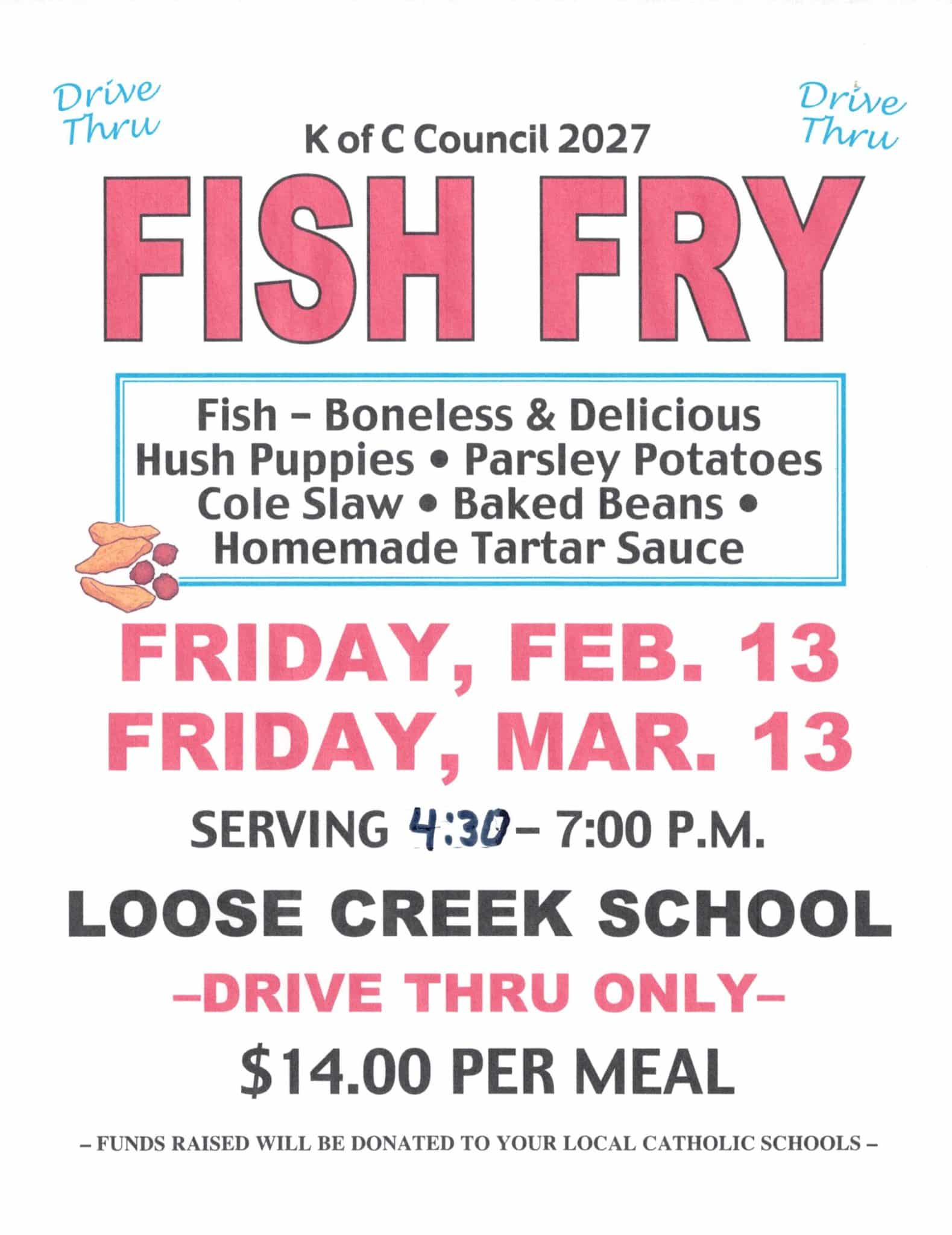 Fish Fry drive-thru sponsored by the Westphalia Knights of Columbus, Friday January 30th from 4 to 6:30 and Friday February 13th from 4 to 7 pm