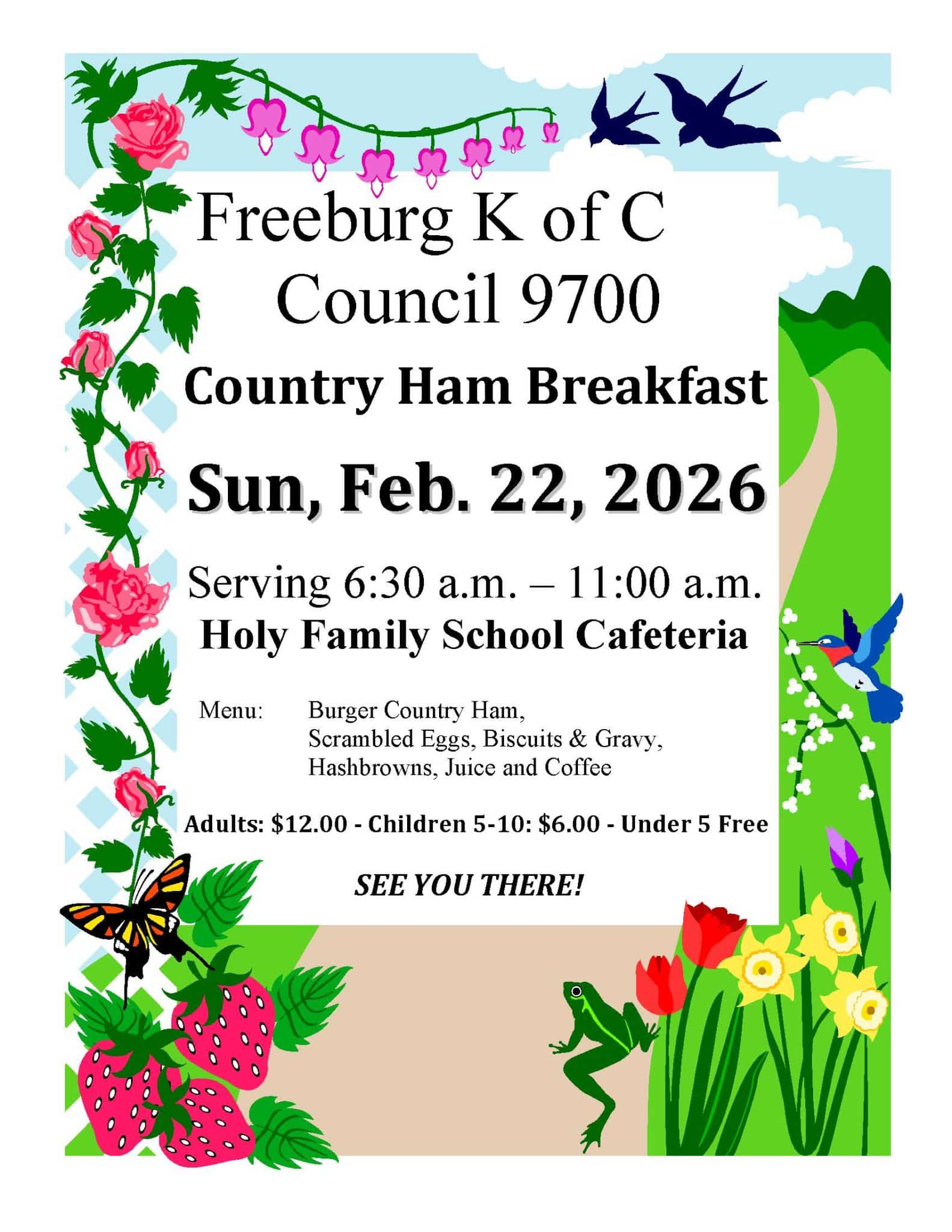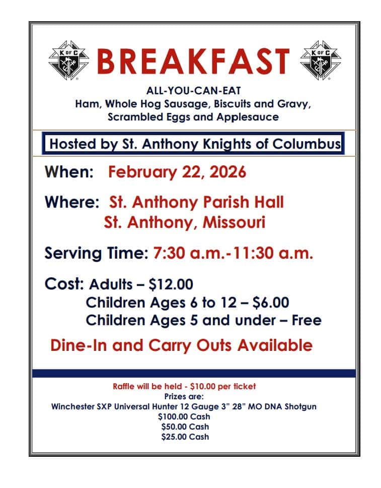 The Freeburg K of C Council 9700 will host a Country Ham Breakfast on Sunday, February 22, 2026 in the school cafeteria. They will be serving from 6:30 a.m. - 11:00 a.m. The menu will include: Burger’s Country Ham, scrambled eggs, biscuits and gravy, hashbrowns, juice and coffee. The cost is adults $12; Children 5-10…