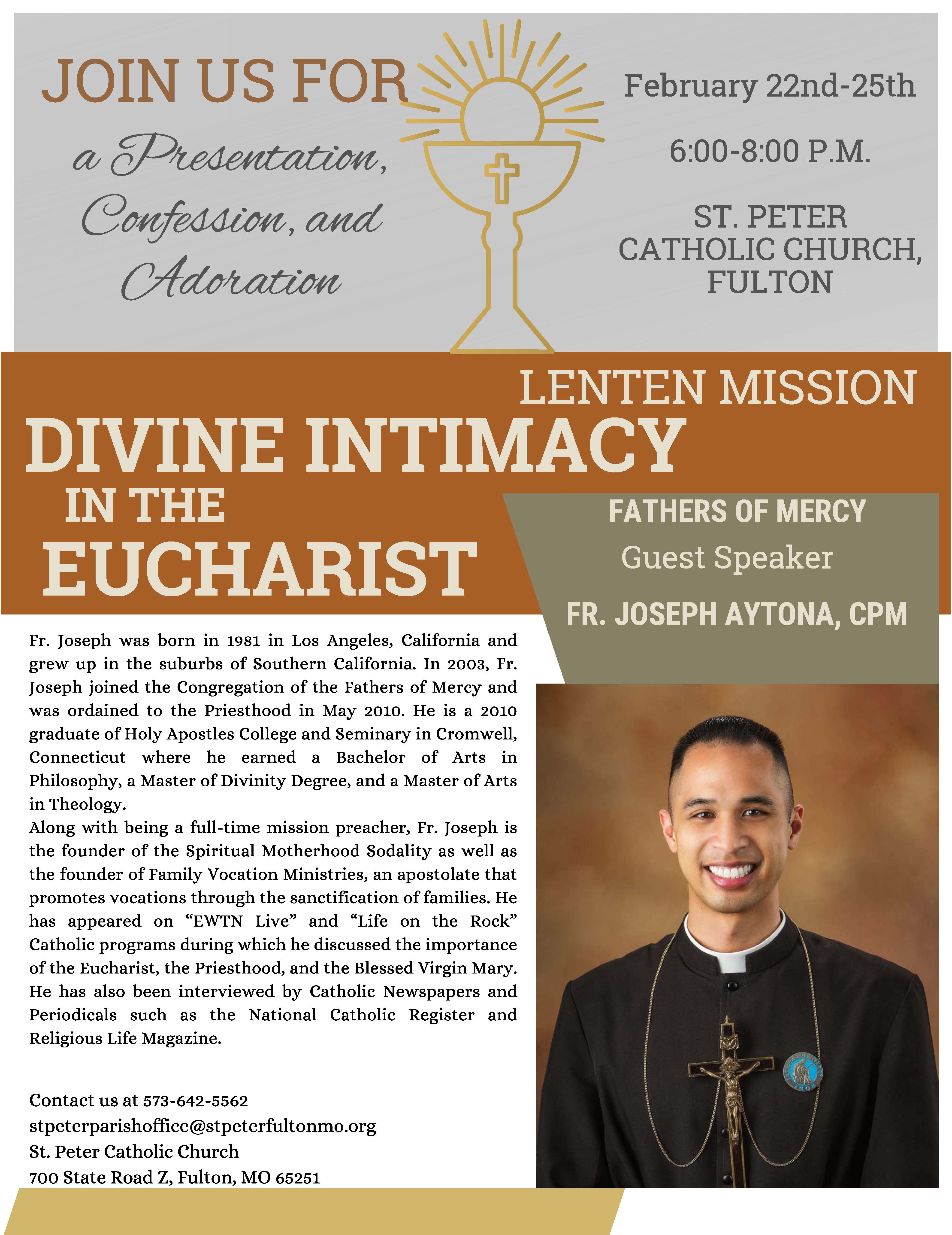 Join St. Peter Parish in Fulton for our Lenten Mission! Fr. Joseph Aytona from the congregation of Fathers of Mercy (CPM) will lead the event. Each evening will begin at 6:00pm with Exposition of the Blessed Sacrament, leading to Confession, and followed by a talk at 7:00pm focusing on "Divine Intimacy in the Eucharist". Confessions…
