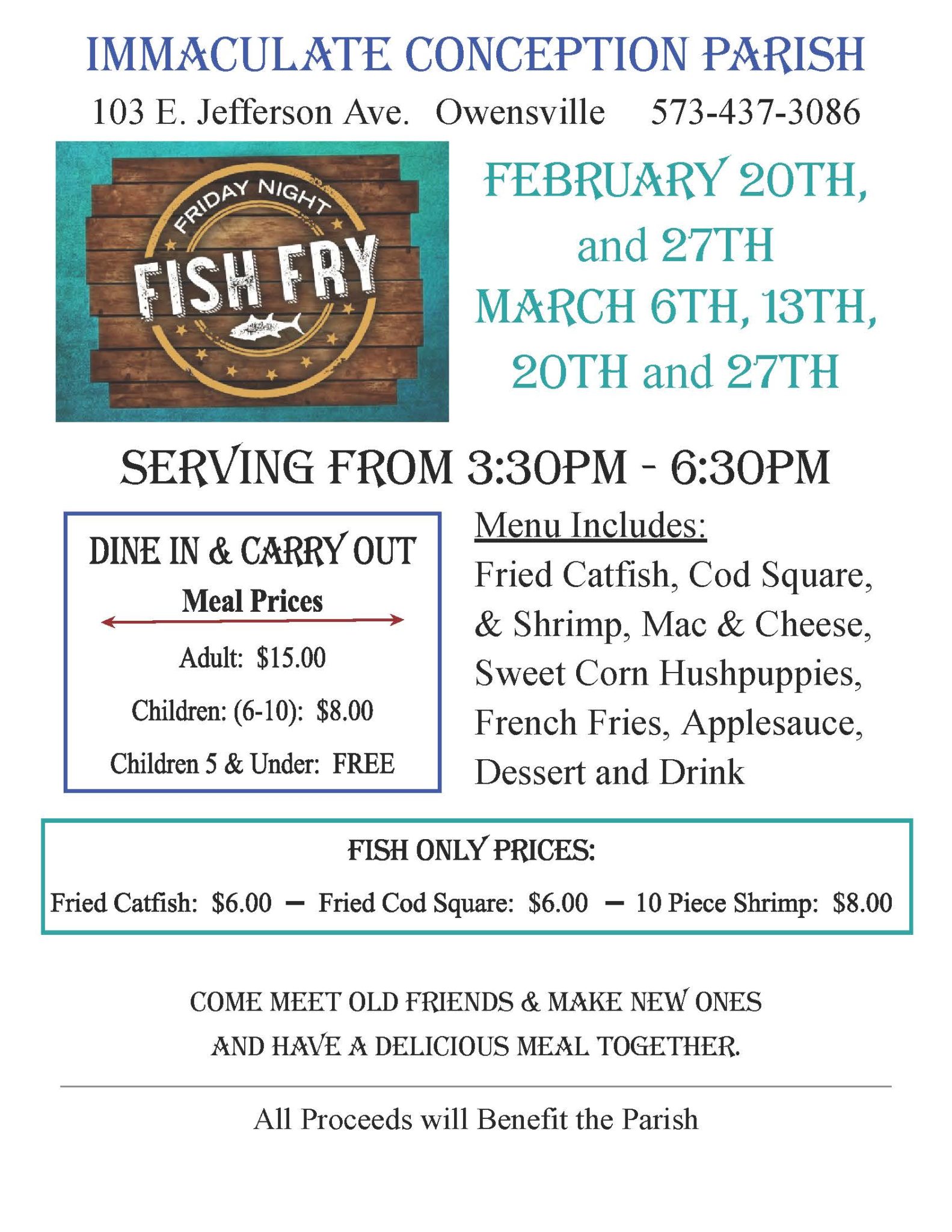 Immaculate Conception Parish 103 E. Jefferson Ave. Owensville 573-437-3086 Friday Night Fish Fry February 20th, and 27th March 6th, 13th, 20th and 27th Serving from 3:30pm - 6:30pm Menu Includes: Fried Catfish, Cod Square, & Shrimp, Mac & Cheese, Sweet Corn Hushpuppies, French Fries, Applesauce, Dessert and Drink Cost Dine In & Carry Out Meal…