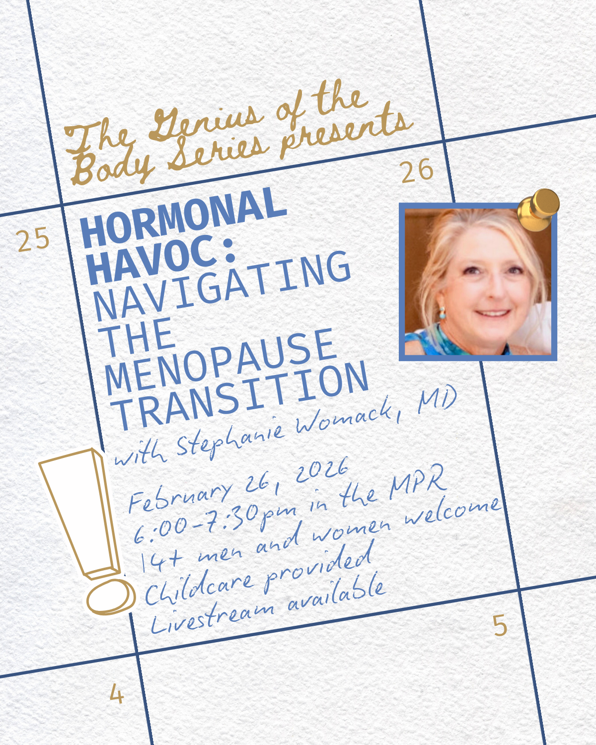 Join us for Genius of the Body Presents: Hormonal Havoc, Navigating the Menopause Transition with Stephanie Womack, MD. February 26, 2026, 6:00-7:30 pm upstairs in the MPR. Ages 14+ men and women welcome! Childcare provided. This is event will be livestreamed for those unable to join us in person. |