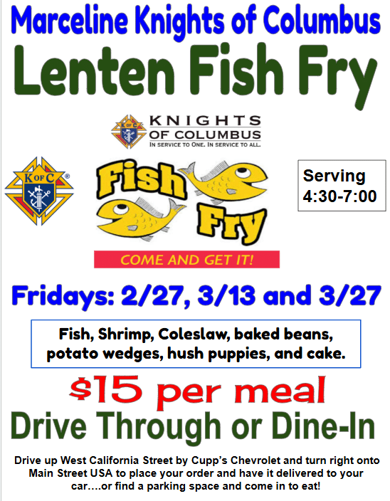 St. Mary Lenten Knights of Columbus Fish Fry. Proceeds to be used to help fund the St. Mary Knights of Columbus Scholarships and other KC Council Projects Father Buhman Center Shelbina, Mo. Contact 573-406-7267 for more information. |