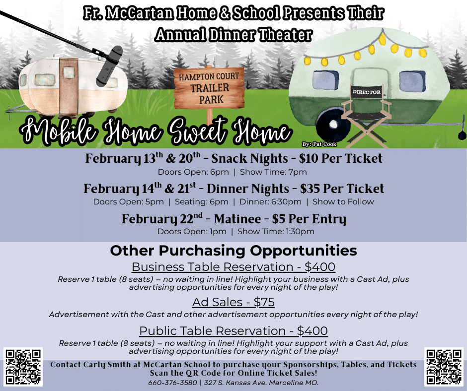 Fr. McCartan School (Marceline) 327 S Kansas Ave, Marceline, MO, United StatesCome enjoy the annual Dinner Theater sponsored by Fr. McCartan Home & School in Marceline, MO. On Saturdays February 14 & 21 you will be treated to a delicious smoked pork chop dinner and see the comedy play “Mobile Home Sweet Home.” Friday nights are bring your own snack nights and tickets for the play…