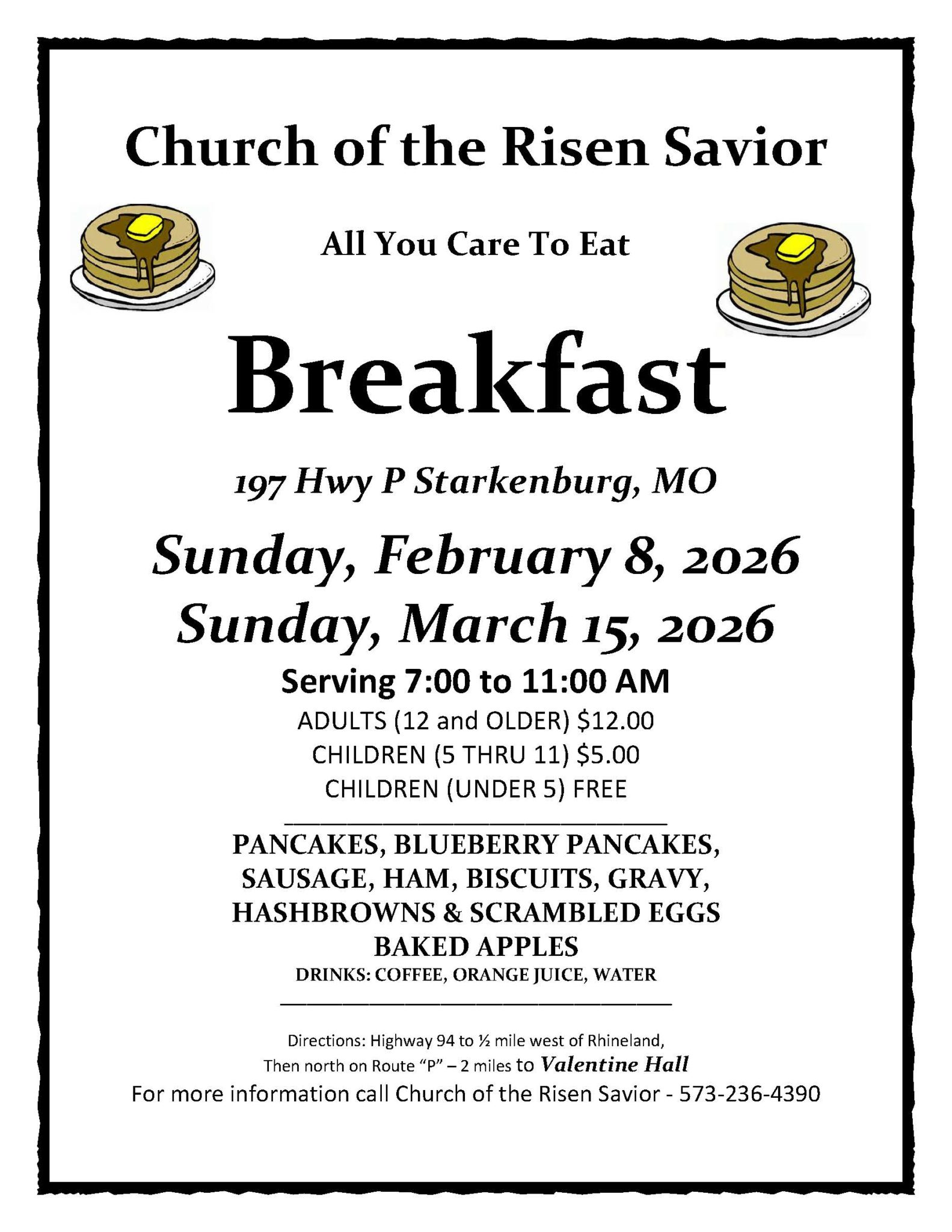 The Men's Organization at Church of the Risen Savior will serve an All You Care to Eat Breakfast at Valentine Hall on Sunday, February 8, 2026 and Sunday, March 15, 2026 from 7:00 - 11:00 AM. They will be serving pancakes, blueberry pancakes, sausage, ham, biscuits, gravy, hashbrowns, scrambled eggs and baked apples with coffee…