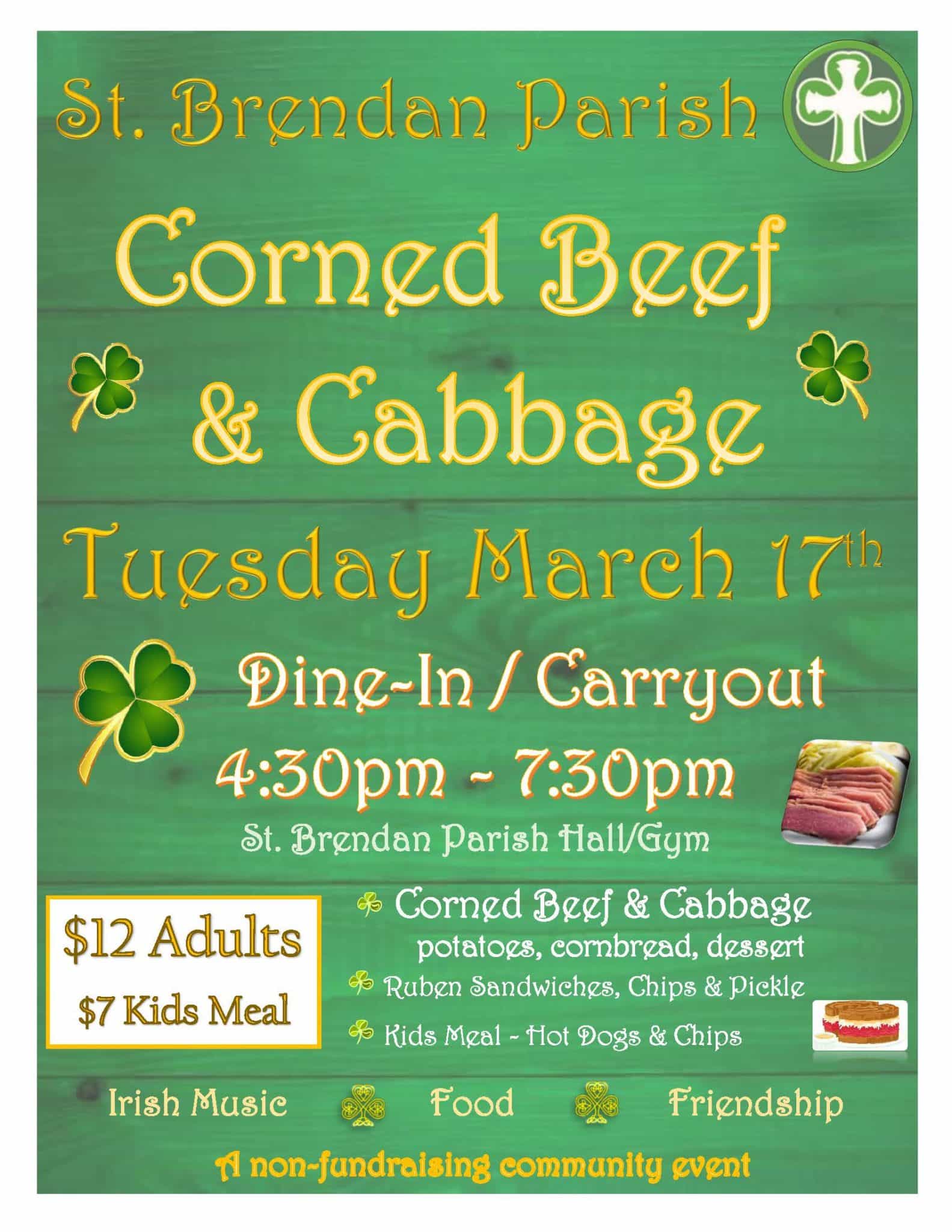 St. Brendan Parish 91st Corned Beef & Cabbage Dinner on Tuesday, March 17. Celebrate St. Patrick's Day with a fine Irish dinner, Irish music and friends. Only $12 per dinner, dine-in or carryout!