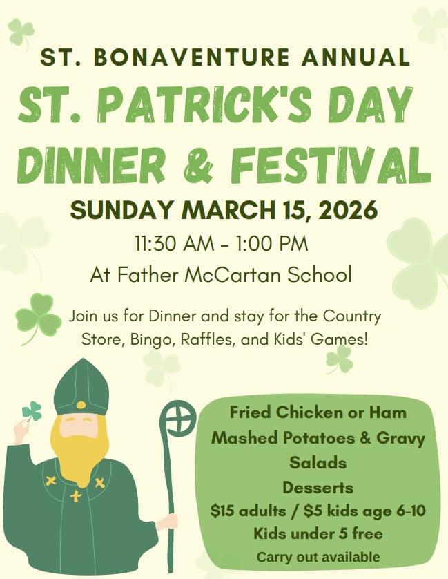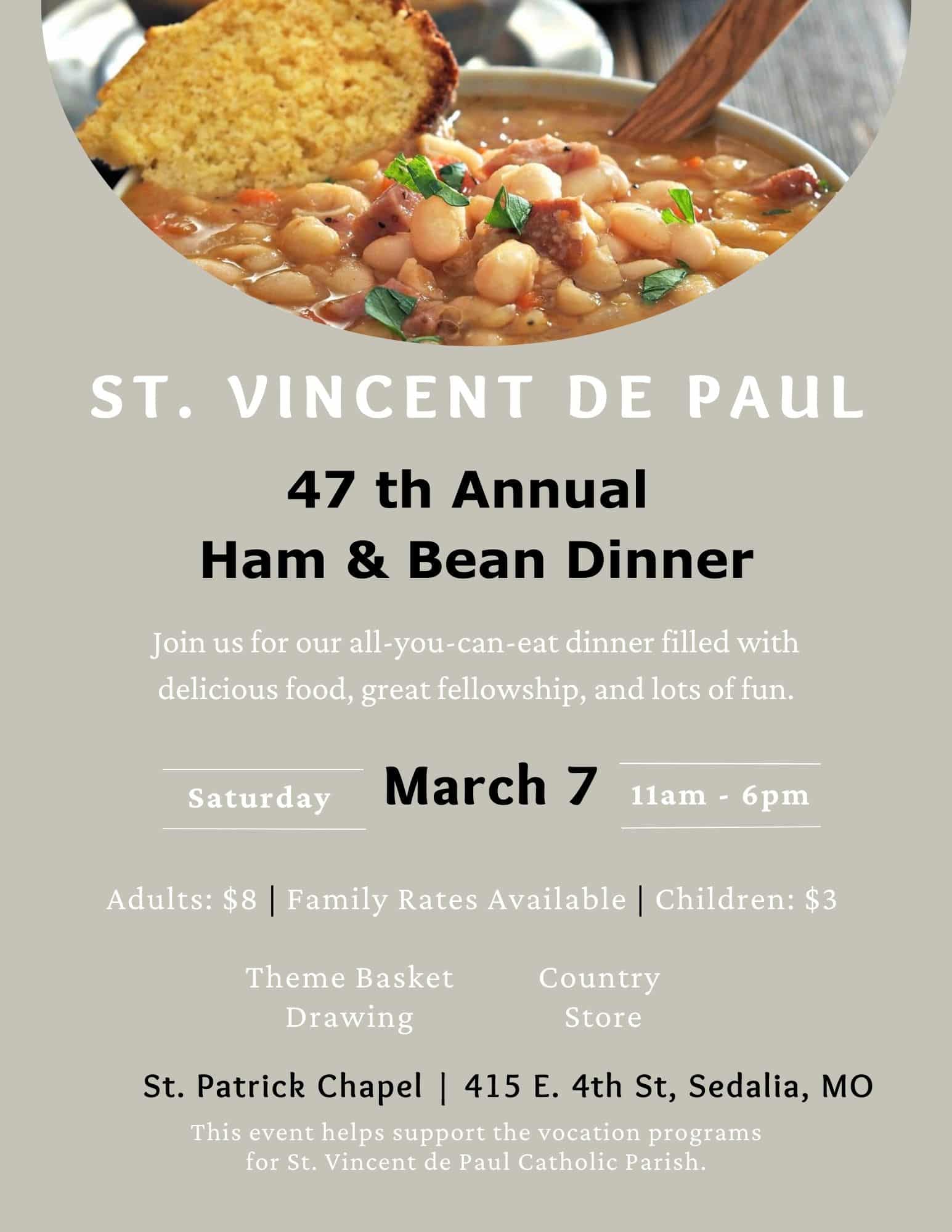 47th Annual Ham & Bean Dinner to support Vocations set for Saturday, March 7, 2026, from 11 a.m. to 6p.m. in St, Patrick Chapel Hall. It is All-You-Can-East Ham & Bean Dinner or Homemade Soup & Ham Sandwich includes slaw, cornbread, drink and dessert for donation $8/adults & $3/children. Stop by and visit the popular… |