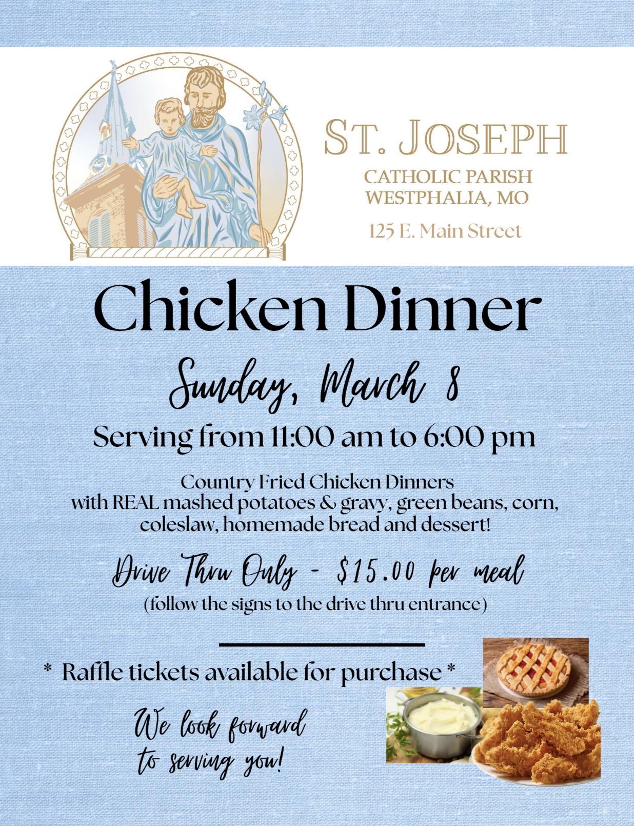 Please see the attached flier. Our Spring Dinner will be held on Sunday, March 8th from 11 am-6 pm. Meals are $15 drive through only. Screenshot