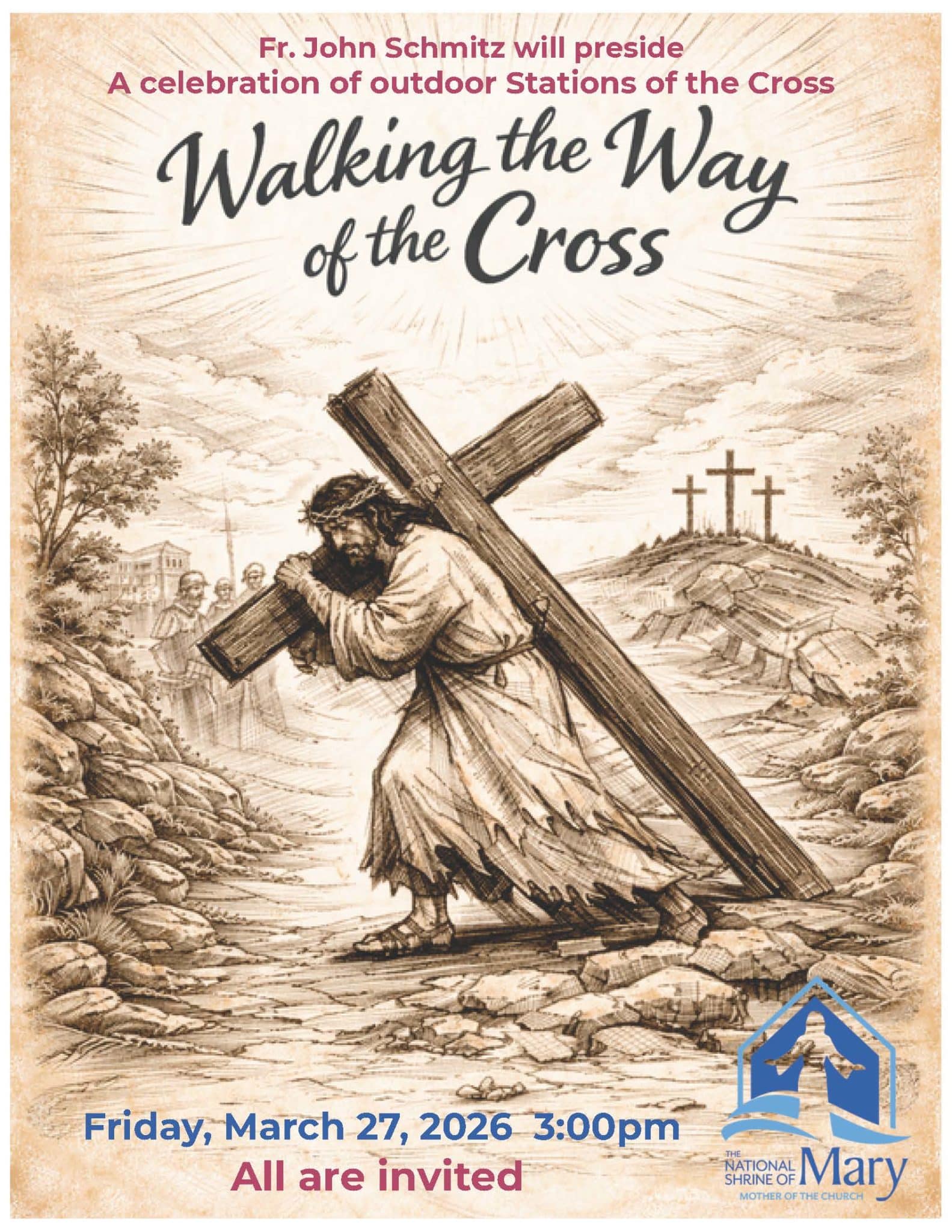 Join your local Marian Shrine and St. Patrick Catholic Church in praying the Stations of the Cross on the beautiful grounds of the Mothers’ Shrine. Walking the Way of the Cross starts at 3pm on Friday March 27, 2026. Fr. John Schmitz will preside. We will continue indoors if weather does not permit us to…