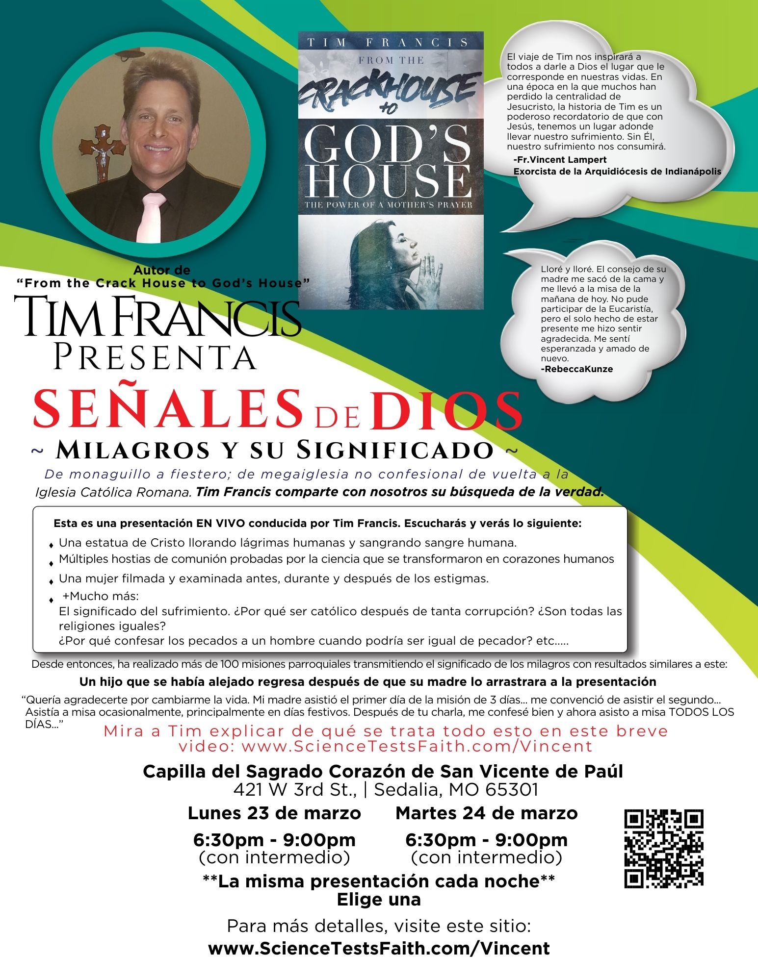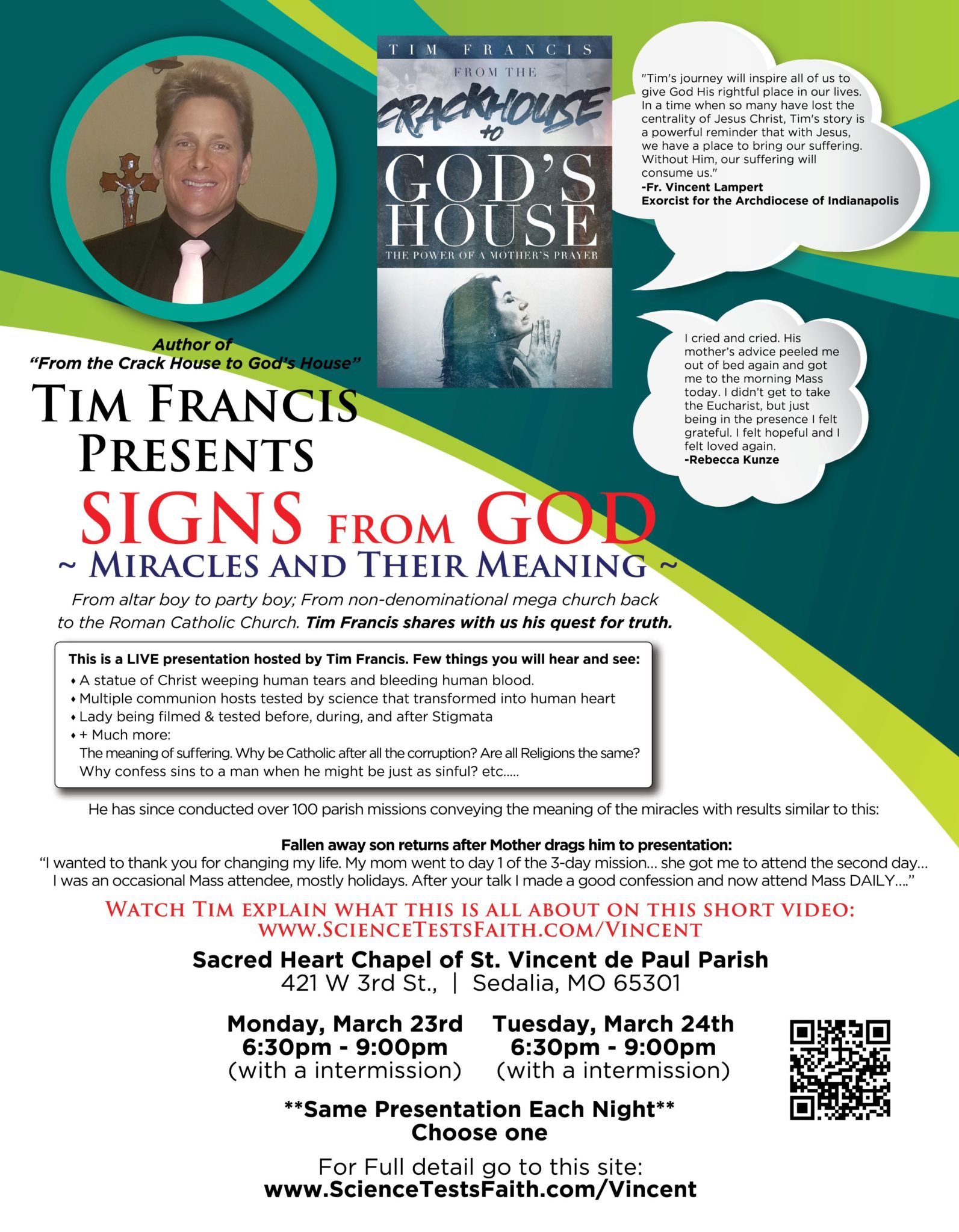 Join us March 23 & 24 as Tim Francis presents Signs from God, Miracles and Their Meanings. Come learn the truths to be found in the Eucharist and strengthen your faith as we approach Holy Week. Join us at the Sacred Heart Chapel of St. Vincent de Paul Parish (421 W 3rd St, Sedalia, MO)…