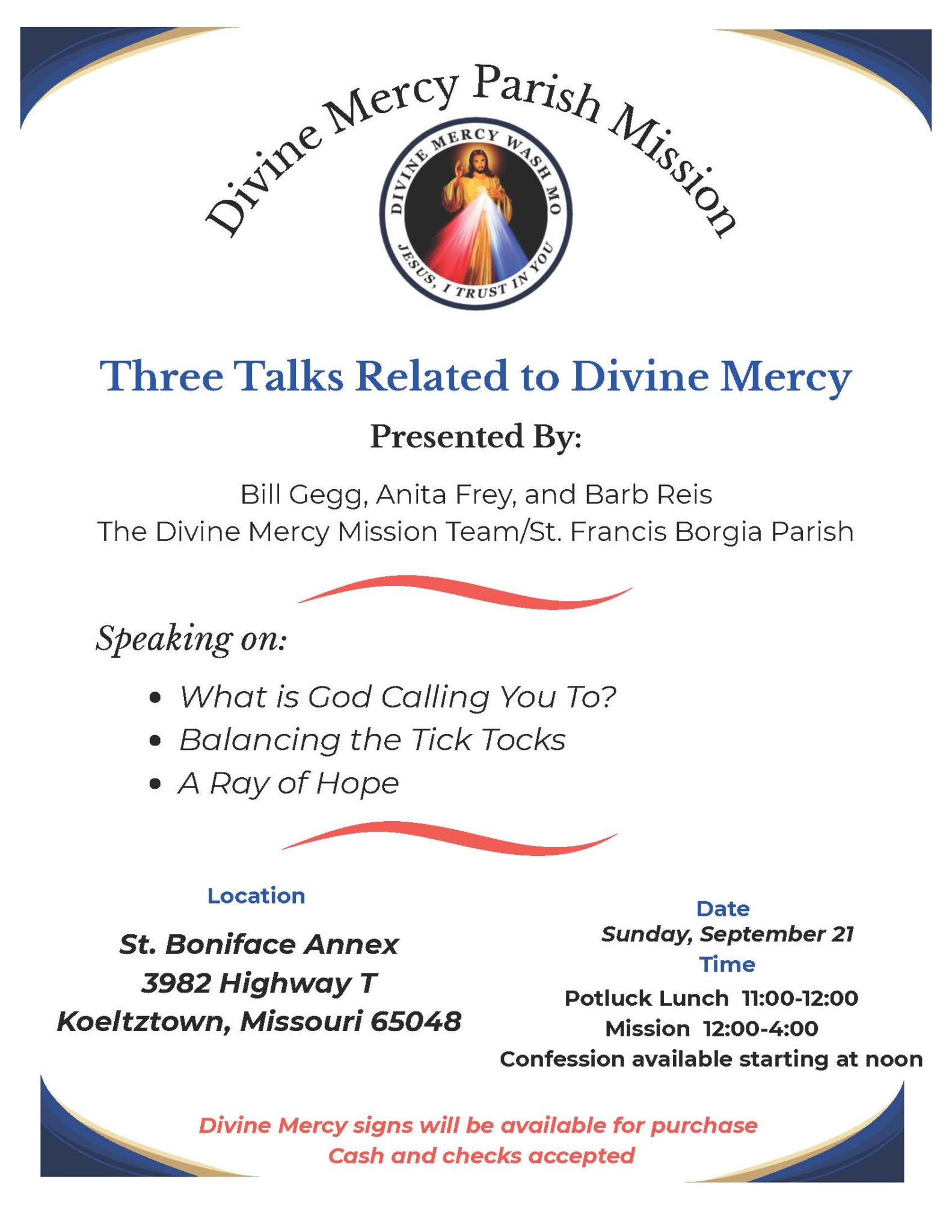 The Women's Ministry of St. Aloysius & St. Boniface will be hosting a Divine Mercy Parish Mission on Sunday, September 21st, 2026 from 11 am-4 pm presented by the Divine Mercy Mission Team from St. Francis Borgia Parish in Washington, MO. The Mission will begin with a potluck lunch at 11:00 am after Mass (We…