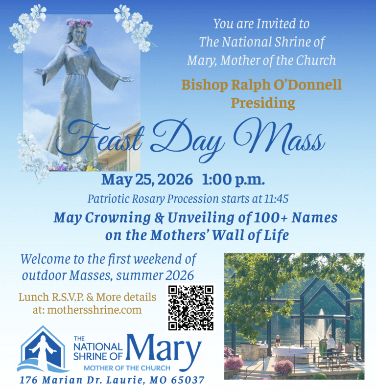 All are welcome to the Mothers' Shrine on May 25th for the feast day celebration. Join Bishop Ralph O’Donnell, the Knights of Columbus, our expansive shrine community and many groups from our diocese in celebrating the Feast of Mary Mother of the Church. Celebration includes the Crowning of Mary, Holy Mass, the Unveiling of the newest mothers’ names on the Mothers’ Wall of Life and a KofC fundraiser lunch. Lunch R.S.V.P. and more information at: mothersshrine.com